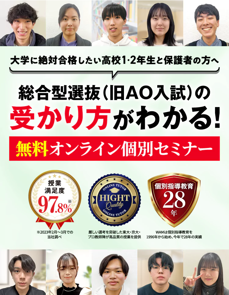一つでも当てはまったら、必ずお役に立てますのでWAMの個別セミナーにご参加ください。 どうすれば総合型選抜(旧AO入試)で合格できるのか、なぜWAMの総合型選抜(旧AO入試)対策なら生徒を合格に導けるのかなど、詳しくお伝えしていきます。